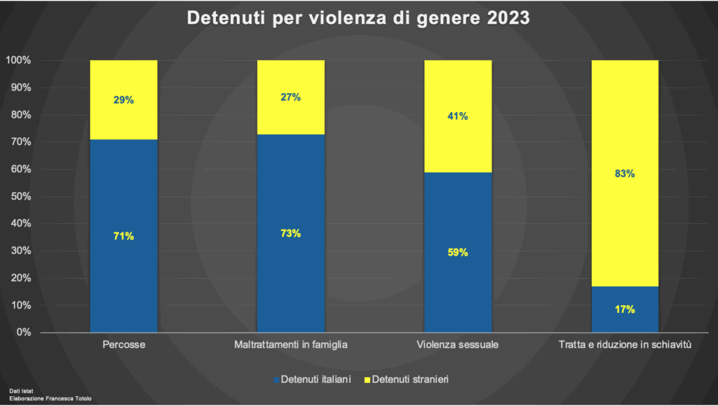 Entrando nello specifico delle cosiddette violenze di genere, nel 2023, il 41 per cento dei detenuti per violenza sessuale era straniero. Poi il 29 per cento per percosse e il 27 per cento per maltrattamenti in famiglia. Addirittura l’83 per cento per tratta e riduzione in schiavitù.