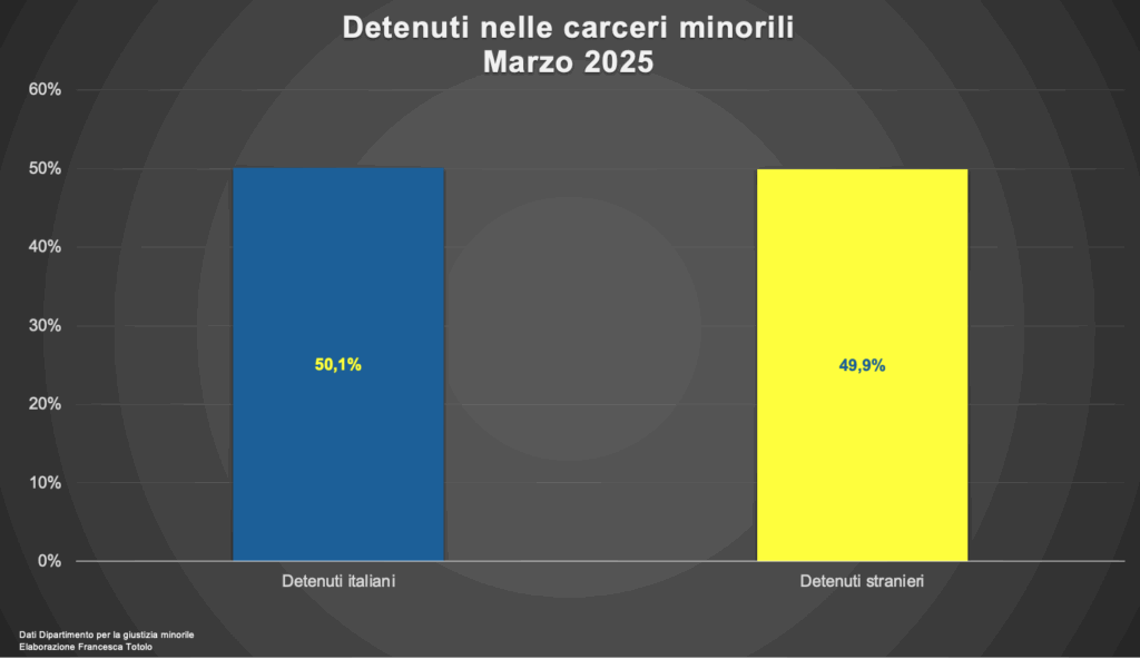 Alla fine del marzo 2025, come documentato dall’ultimo rapporto di Antigone, erano 597 i detenuti nelle carceri minorili italiane. Di questi, ben il 49,9 per cento erano stranieri. Un dato allarmante che comunque non descrive perfettamente la realtà vista la forte presenza di minori stranieri con cittadinanza italiana.