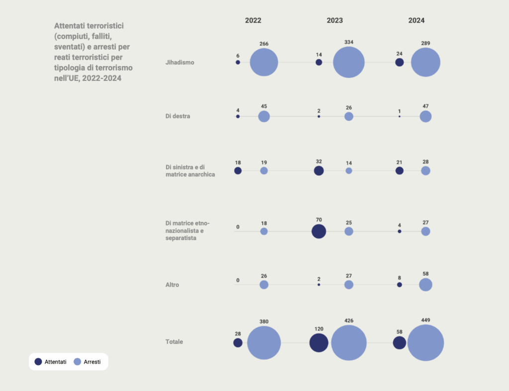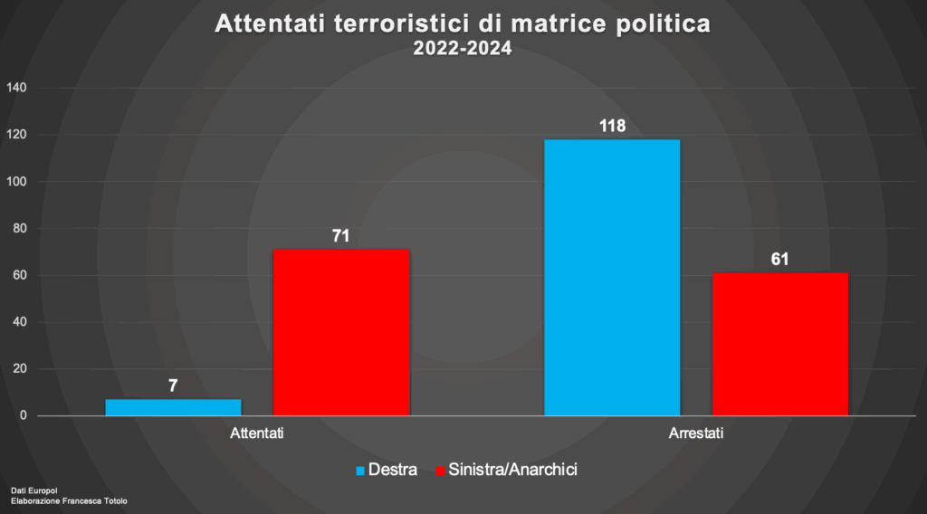 Dei 7 attentati commessi da movimenti riconducibili alla destra, due sono andati a segno mentre, tra quelli riconducibili alla sinistra e all’area anarchica, 53 sono stati portati a termine. L’unico attentato in Italia, inserito da Europol come terrorismo di destra, è avvenuto nella notte del 18 marzo 2024, a Montello, in provincia di Vicenza: un uomo aveva tentato di appiccare un incendio all’ingresso di un centro islamico. L’individuo però non era militante di alcun movimento della destra radicale.