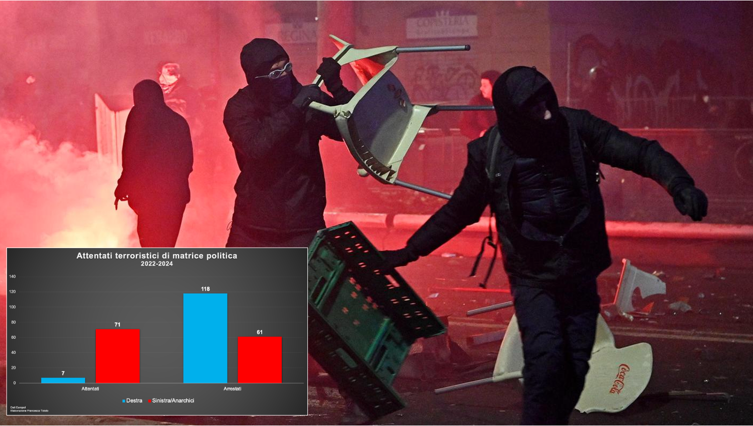 L’ultimo rapporto dell’Europol sugli attentati terroristici svela che sinistra e anarchici sono responsabili del 91 per cento degli attentati di natura politica, ben 71 su 78, dal 2022 al 2024.