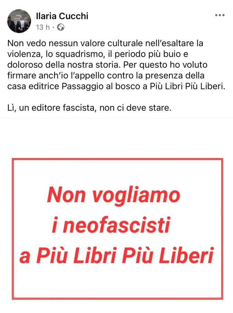Solo un anno prima, la Cucchi si era spesa pubblicamente per protestare contro l’annunciato sgombero dello Spin Time Labs, palazzone di proprietà di un privato occupato dall’estrema sinistra, perché da lei ritenuto una “realtà fondamentale per la città di Roma”. “Ch’assolver non si può chi non si pente, né pentere e volere insieme puossi, per la contradizion che nol consente”, scriveva Dante nella Divina Commedia. A Più Libri Più Liberi, “un editore fascista non ci deve stare”. Ma la senatrice non aveva rifiutato l’invito di CasaPound. Anzi aveva ringraziato il movimento per lo spazio che le era stato concesso.