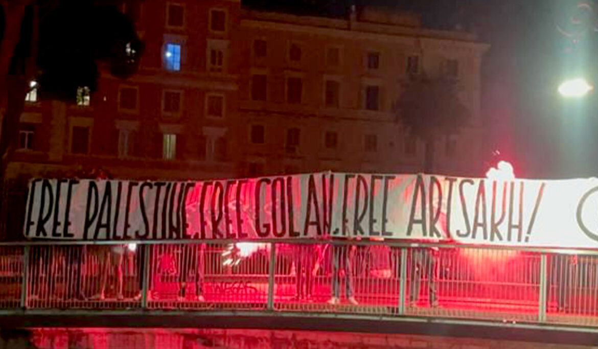 Nella nota rilasciata dal movimento si esprime la volontà di contestare una “linea politica che rappresenta repressione, oppressione ed occupazione”. Quale? Quella del partito di maggioranza della Knesset – il Lykud israeliano – che a Roma è stato invitato al “Raduno delle destre europee” insieme a rappresentanti del Partito Repubblicano, ma anche il francese Rassemblement National, l’ungherese Fidesz e il tedesco AfD. Tutti partiti che secondo gli studenti che hanno esposto lo striscione “hanno come comun denominatore l’essere filorussi ed antieuropei”. Nello striscione i militanti hanno voluto lanciare un messaggio trasversale: “Free Palestine, free Golan, free Artsakh“. Una triplice scelta che ha mandato in tilt giornali e titolisti, che è stata motivata dall’appoggio che Israele fornisce attivamente allo stato azero contro le comunità armene del Nagorno-Karabakh; dalla “storica” occupazione della regione del Golan ai danni della Syria e i continui bombardamenti sulle sue strutture strategiche e civili; dall’assedio militare ed economico che Israele mantiene sulla Striscia di Gaza. “Nessun giovane Europeo oggi – inizia la nota del movimento – può vedere Israele e Stati Uniti come interlocutori accettabili per una politica di stabilità euro-mediterranea in chiave sovrana. Tantomeno partiti che hanno come comun denominatore l’essere filorussi ed antieuropei. La sistematica destabilizzazione portata avanti in questi anni dalla Knesset in Syria, Giordania, Palestina ed Armenia ha causato oltre ad un continuo e sottaciuto genocidio del popolo palestinese nella Striscia di Gaza, un fenomeno migratorio che si è riversato sull’Europa con l’ombra lunga dello Stato Islamico. Un’organizzazione terroristica – ricordiamo – protetta e foraggiata dagli Israeliani insieme a Stati Uniti, Turchia e Arabia Saudita in funzione anti-Siriana. Un’organizzazione che in poco meno di dieci anni ha causato centinaia di morti a Parigi, Nizza, Barcellona, Londra, Manchester, Bruxelles e Stoccolma – solo per citare gli attacchi maggiori – battezzati nel 2015 con il sangue della gioventù francese”. Poi la chiosa che invita gli studenti e i giovani a liberarsi degli schemi imposti: “I giovani devono sapere che in Italia e in Europa non ci sarà mai spazio per gli stati imperialisti e i loro apologeti: che si chiamino Russi, Americani o Israeliani non accetteremo mai linee politiche che rappresentano repressione, oppressione ed occupazione. La scelta di campo sposata dalla destra dimostra ancora una volta la miopia politica di una classe dirigente che non vede altra possibilità di dialogo se non dentro gli schemi imposti da altri. La gioventù nazional rivoluzionaria europea deve tracciare una linea di demarcazione netta da questa linea politica estera che ci vede solo come subalterni: è una visione profondamente ed essenzialmente anti-europea”.