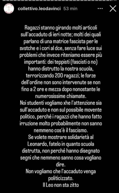 All’indomani del raid, in un comunicato, il collettivo studentesco Leonardo Da Vinci ha sottolineato: “Noi studenti vogliamo che l’attenzione sia sull’accaduto e non sul possibile movente politico, perché i ragazzi che hanno fatto irruzione molto probabilmente non sanno nemmeno cos’è il fascismo”. Gli studenti presenti, che stavano occupando il liceo e hanno assistito all’assolto, hanno testimoniato che “i teppisti farebbero parte di un gruppo di maranza (giovani stranieri e immigrati di seconda generazione) e avrebbero tra i 15 e i 17 anni”. A questo punto, vengono pubblicate altre immagini, oltre a quella di una svastica: “Free Sosa” campeggia su un muro della scuola. Sosa, o alternativamente Chief Keef, pseudonimo del rapper afroamericano Keith Farrelle Cozart, è stato arrestato diverse volte per reati legati allo spaccio, resistenza a pubblico ufficiale, sparatorie, violazione della libertà vigilata e pestaggi. Quel “Free Sosa” è diventato virale anche in Italia attraverso i rapper di origine nordafricana e i loro fan.