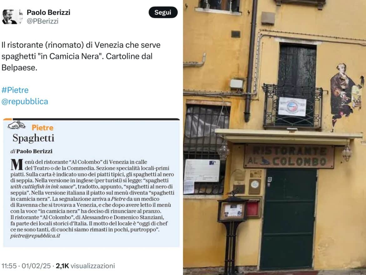 Roma, 3 feb – L’ossessione antifascista colpisce ovunque, anche in cucina. A scatenare gli isterismi della sinistra è il menù di “Al Colombo”, ristorante storico di Venezia vicino al teatro Goldoni, e in particolare dei suoi spaghetti al nero di seppia, chiamati spaghetti in camicia nera.