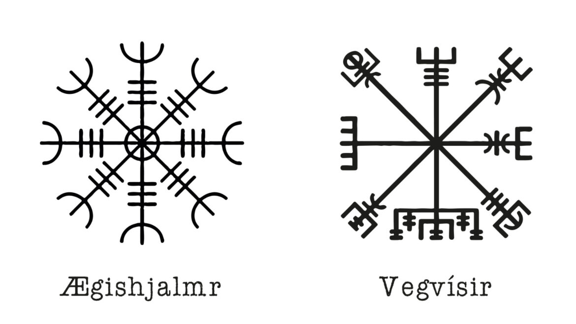 Cosa sappiamo invece dell’ancora più noto Vegvísir? L’etimologia rimanda all’antico norreno víss (l’essere saggio, cioè a conoscenza di qualcosa, dalla radice *u̯eid- che significa essere saggio nel senso di vedere e dunque sapere, contiguo ma non coincidente all’etimologia di vate), e poiché vegr è il percorso da intraprendere, il simbolo chiamato Vegvísir promette di non far perdere chi lo porti. In effetti è questo ciò che promette la didascalia che accompagna il disegno nel Manoscritto di Huld: se porti questo simbolo non ti perderai nelle tempeste, anche se la strada da percorrere ti è ignota.