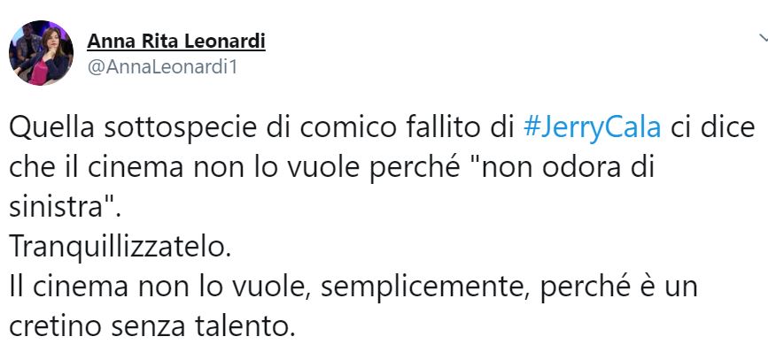 E’ il caso ad esempio della dirigente provinciale del Pd di Salerno, Anna Rita Leonardi, che ha pensato di mostrare agli incivili di destra come si usa Twitter: “Quella sottospecie di comico fallito di #JerryCala ci dice che il cinema non lo vuole perché ‘non odora di sinistra’. Tranquillizzatelo. Il cinema non lo vuole, semplicemente, perché è un cretino senza talento”. Così ha scritto l’esponente coi fiocchi del Partito Democratico, offendendo l’attore perché in un’intervista a Il Giornale aveva spiegato la sua lunga assenza dalla scena cinematografica.