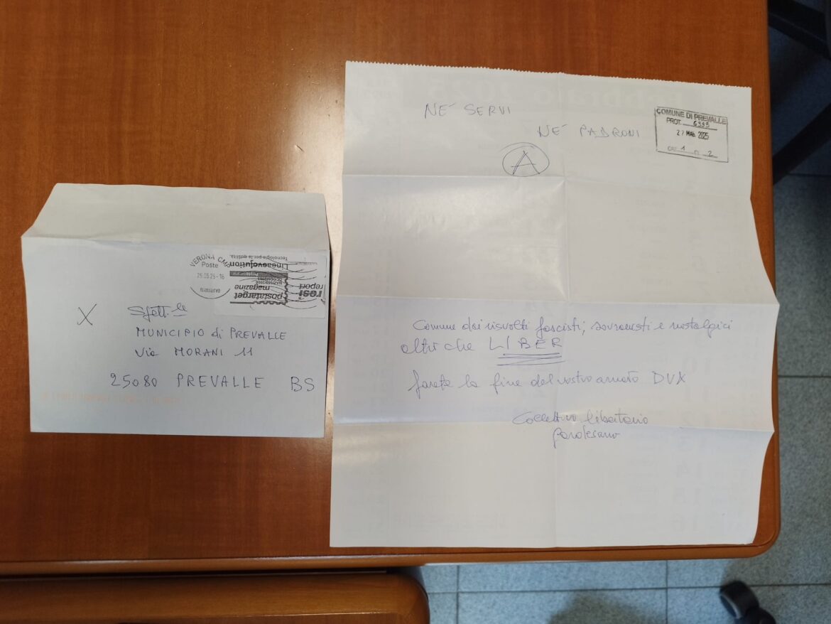 Nella missiva si leggono espressioni intimidatorie come: “Né servi né padroni” (con simbolo anarchico). “Comune dai risvolti fascisti, sovranisti e nostalgici. Altro che LIBER. Farete la fine del vostro amato Dux” Il contenuto della lettera, pur rivolto formalmente al Comune, è chiaramente riferito alla manifestazione culturale LIBER, organizzata dal Comune di Prevalle e tenutasi con successo il 24 e 25 maggio presso Palazzo Morani. Il timbro postale riporta la data del 26 maggio, il che lascia supporre che la lettera sia stata scritta prima dello svolgimento della manifestazione, nella probabile intenzione di intimidire gli organizzatori e gettare discredito sull’iniziativa. Il Comune di Prevalle condanna con la massima fermezza ogni forma di minaccia, intimidazione e violenza verbale, e ha già provveduto a segnalare l’accaduto alle autorità competenti per gli opportuni accertamenti.