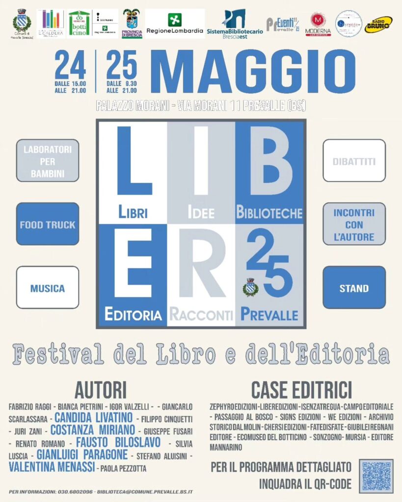 Durante la manifestazione verranno inoltre premiati i migliori lettori di Prevalle per l’anno 2024, ci saranno laboratori didattici per bambini e la possibilità di visitare il museo dello Spiedo e della Civiltà Contadina. L’ingresso è gratuito anche se per alcune presentazioni sarà consigliata la prenotazione, soprattutto per gli eventi con ospiti più noti. LIBER è realizzato con il patrocinio di Regione Lombardia, Provincia di Brescia e Sistema Bibliotecario Bresciano.