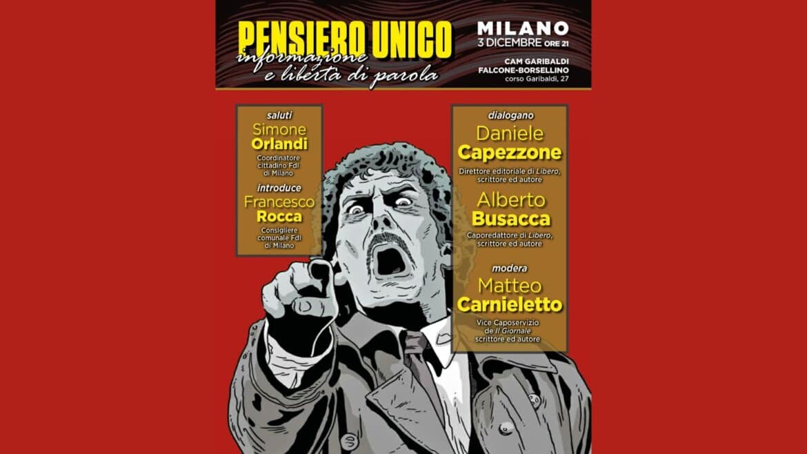 Roma, 29 nov – Il prossimo 3 dicembre a Milano si terrà un dibattito pubblico dal titolo “Pensiero unico, informazione e libertà di parola”. L’evento si terrà alle ore 21 presso il Cam Garibaldi di corso Garibaldi 27 del capoluogo meneghino. Un’occasione per mettere in discussione e scardinare le nuove forme di censura imposte dalla sinistra. L’evento è promosso da Fratelli d’Italia